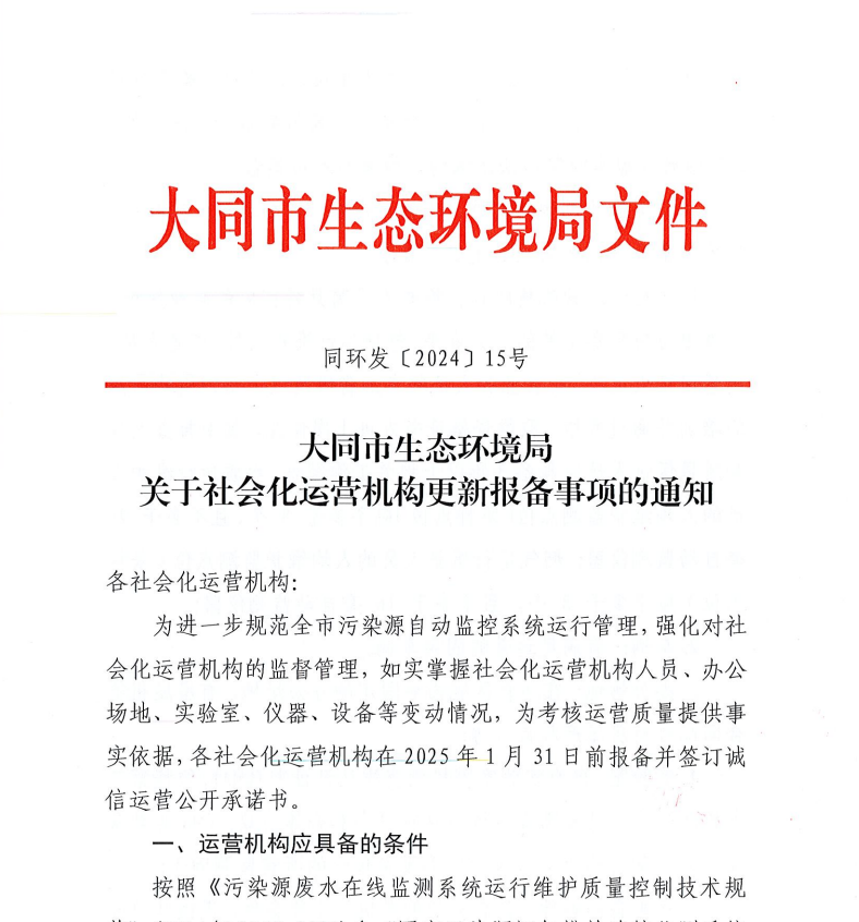 大同市生態環境局關于社會化運營機構更新報備事項的通知