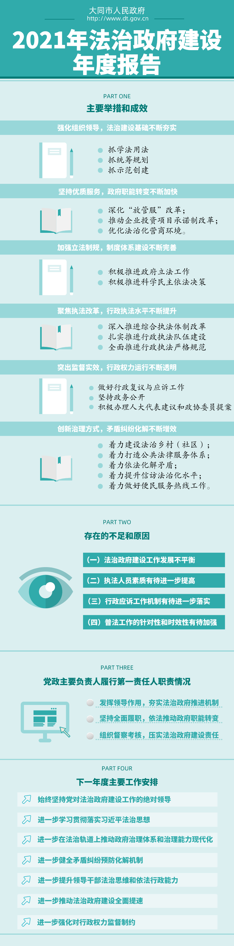 2021年是實施“十四五”規(guī)劃開局之年,也是《法治政府建設(shè)實施綱要(2021-2025年)》啟動實施之年。一年來,大同市堅持以習(xí)近平新時代中國特色社會主義思想為指導(dǎo),深入學(xué)習(xí)貫徹習(xí)近平法治思想,全面貫徹落實黨的十九大和十九屆歷次全會精神,深入貫徹落實習(xí)近平總書記視察山西重要講話重要指示精神和省第十二次黨代會精神,認(rèn)真貫徹落實黨中央、國務(wù)院及省委、省政府關(guān)于法治政府建設(shè)的決策部署,扎實推進(jìn)依法行政各項工作,法治政府建設(shè)取得積極成效。