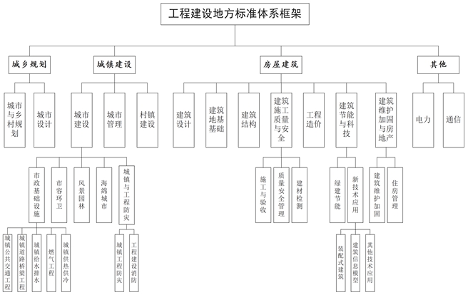 完善地方標準框架。根據國家工程建設標準體系所涵蓋的專業領域,結合我省自身情況,工程建設地方標準建設劃分為四大部分共十四個專業:城鄉規劃部分(包括城市與鄉村規劃、城市設計)、城鎮建設部分(包括城市建設、城市管理、村鎮建設)、房屋建筑部分(包括建筑設計、建筑地基基礎、建筑結構、建筑施工質量與安全、工程造價、建筑節能與科技、建筑維護加固與房地產)、其他部分(包括電力、通信),標準體系框架及編碼說明詳見下圖表: