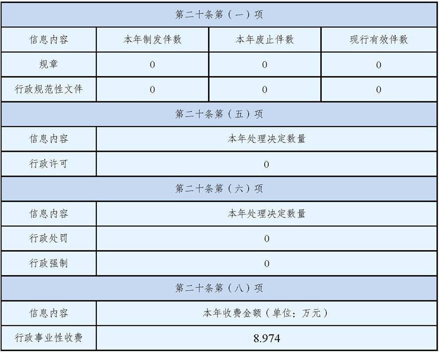 2022年我局未制定規章和規范性文件;沒有行政許可、行政處罰及行政強制事項;行政事業性收費1項;未發生涉及局機關政務公開的行政復議和行政訴訟。
