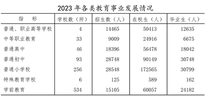 全市普通、職業(yè)高等學(xué)校4所,中等職業(yè)教育學(xué)校33所,普通高中46所,普通初中93所,普通小學(xué)256所,特殊教育6所,學(xué)前教育534所。