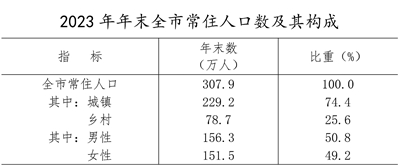 據(jù)2023年人口抽樣調(diào)查,年末全市常住人口為307.9萬人,比上年末減少2.2萬人。其中,城鎮(zhèn)常住人口229.2萬人,占常住人口比重為74.4%,比上年末提高0.7個(gè)百分點(diǎn)。全年全市出生人口1.7萬人,人口出生率為5.6‰;死亡人口2.6萬人,死亡率為8.3‰;自然增長率為-2.7‰。