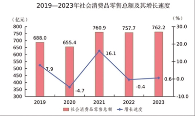 全年全市社會(huì)消費(fèi)品零售總額762.2億元,比上年增長0.6%。按經(jīng)營地統(tǒng)計(jì),城鎮(zhèn)消費(fèi)品零售額609.9億元,增長0.3%;鄉(xiāng)村消費(fèi)品零售額152.3億元,增長1.9%。按消費(fèi)類型統(tǒng)計(jì),商品零售額695.7億元,增長0.5%;餐飲收入額66.5億元,增長1.6%。