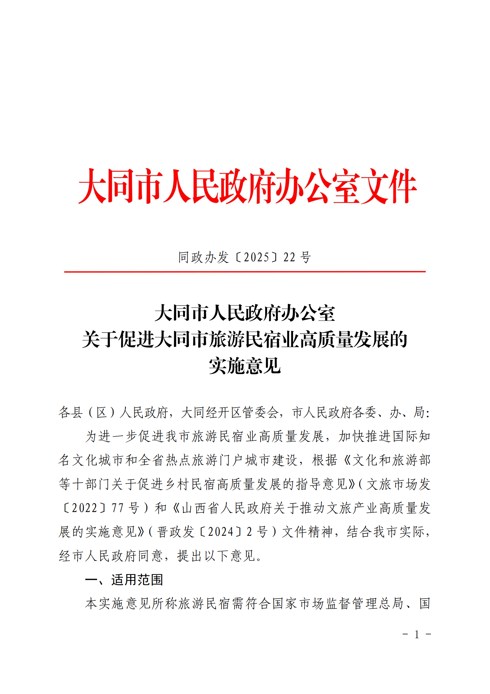 大同市人民政府辦公室關于促進大同市旅游民宿業高質量發展的實施意見