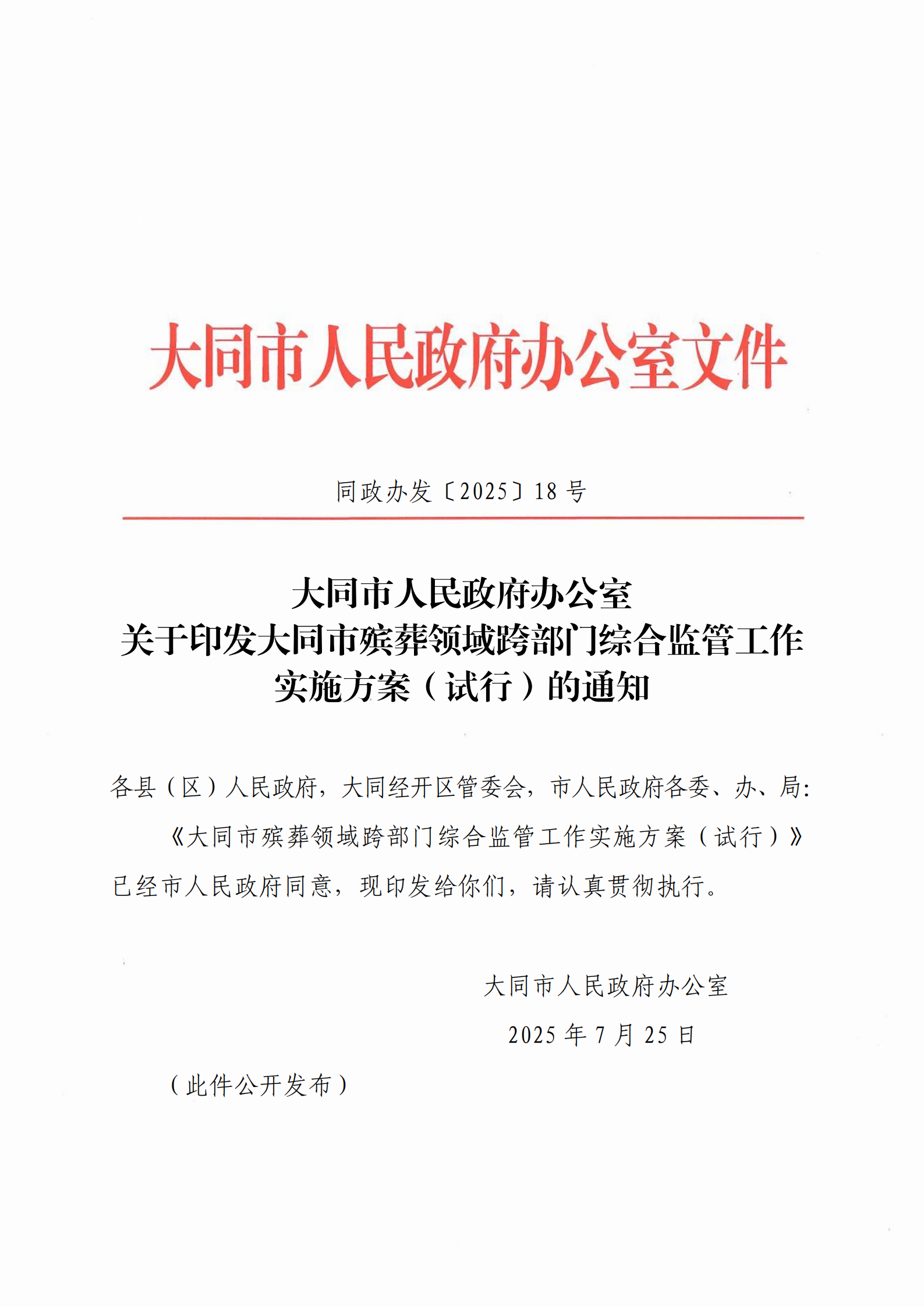 大同市人民政府辦公室關于印發大同市殯葬領域跨部門綜合監管工作實施方案(試行)的通知
