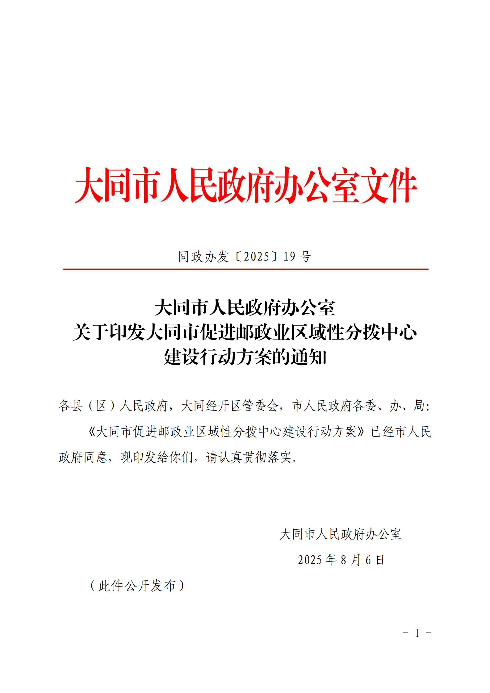 大同市人民政府辦公室關于印發大同市促進郵政業區域性分撥中心建設行動方案的通知