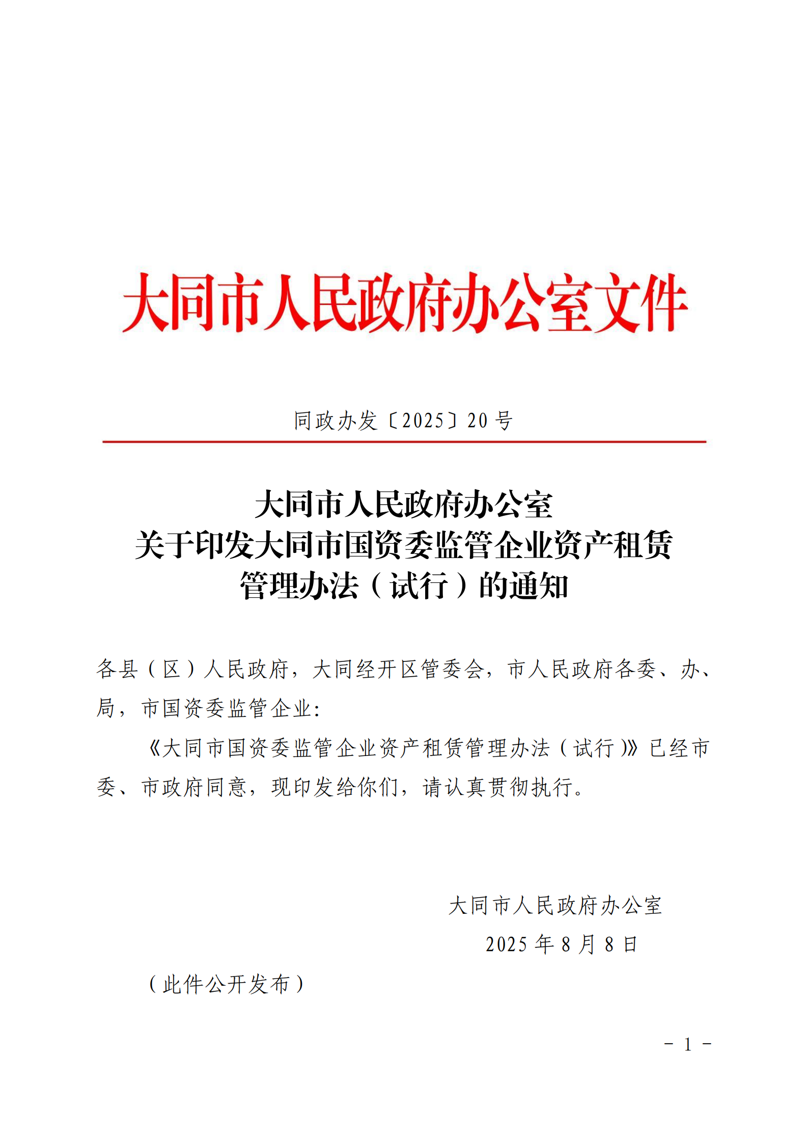 大同市人民政府辦公室關于印發大同市國資委監管企業資產租賃管理辦法(試行)的通知