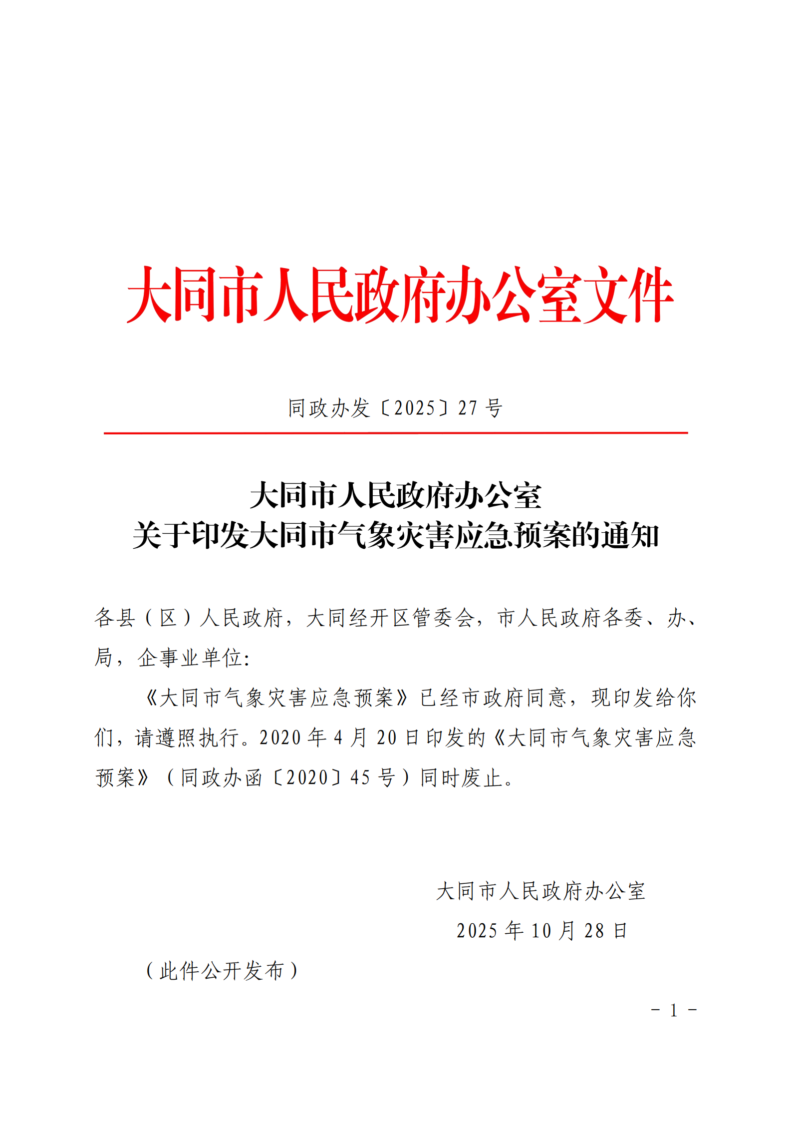 《大同市氣象災(zāi)害應(yīng)急預(yù)案》已經(jīng)市政府同意,現(xiàn)印發(fā)給你們,請(qǐng)遵照?qǐng)?zhí)行。2020年4月20日印發(fā)的《大同市氣象災(zāi)害應(yīng)急預(yù)案》(同政辦函〔2020〕45號(hào))同時(shí)廢止。