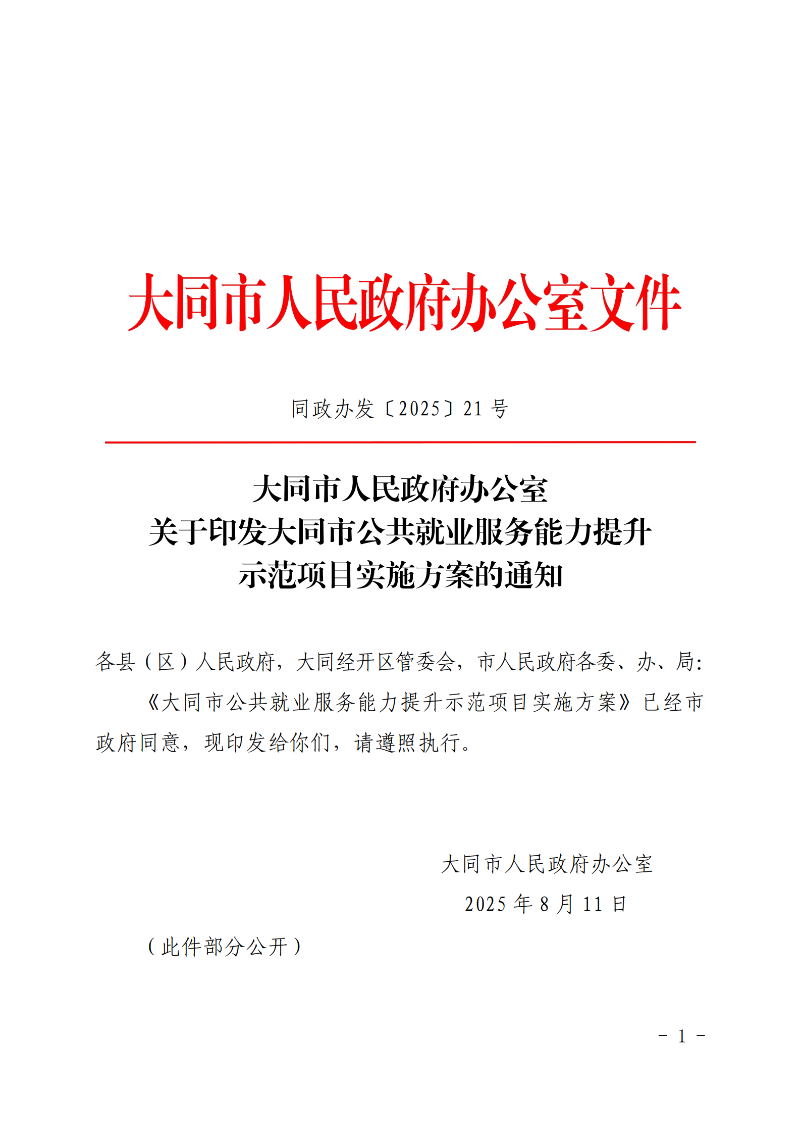 大同市人民政府辦公室關于印發大同市公共就業服務能力提升示范項目實施方案的通知