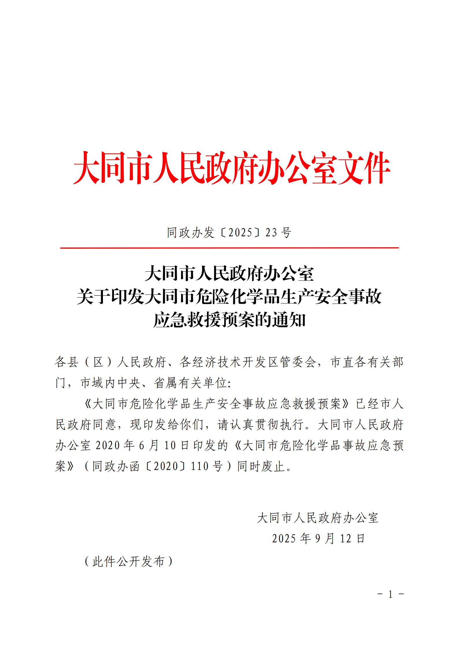 《大同市危險化學品生產安全事故應急救援預案》已經市人民政府同意,現印發給你們,請認真貫徹執行。大同市人民政府辦公室2020年6月10日印發的《大同市危險化學品事故應急預案》(同政辦函〔2020〕110號)同時廢止。