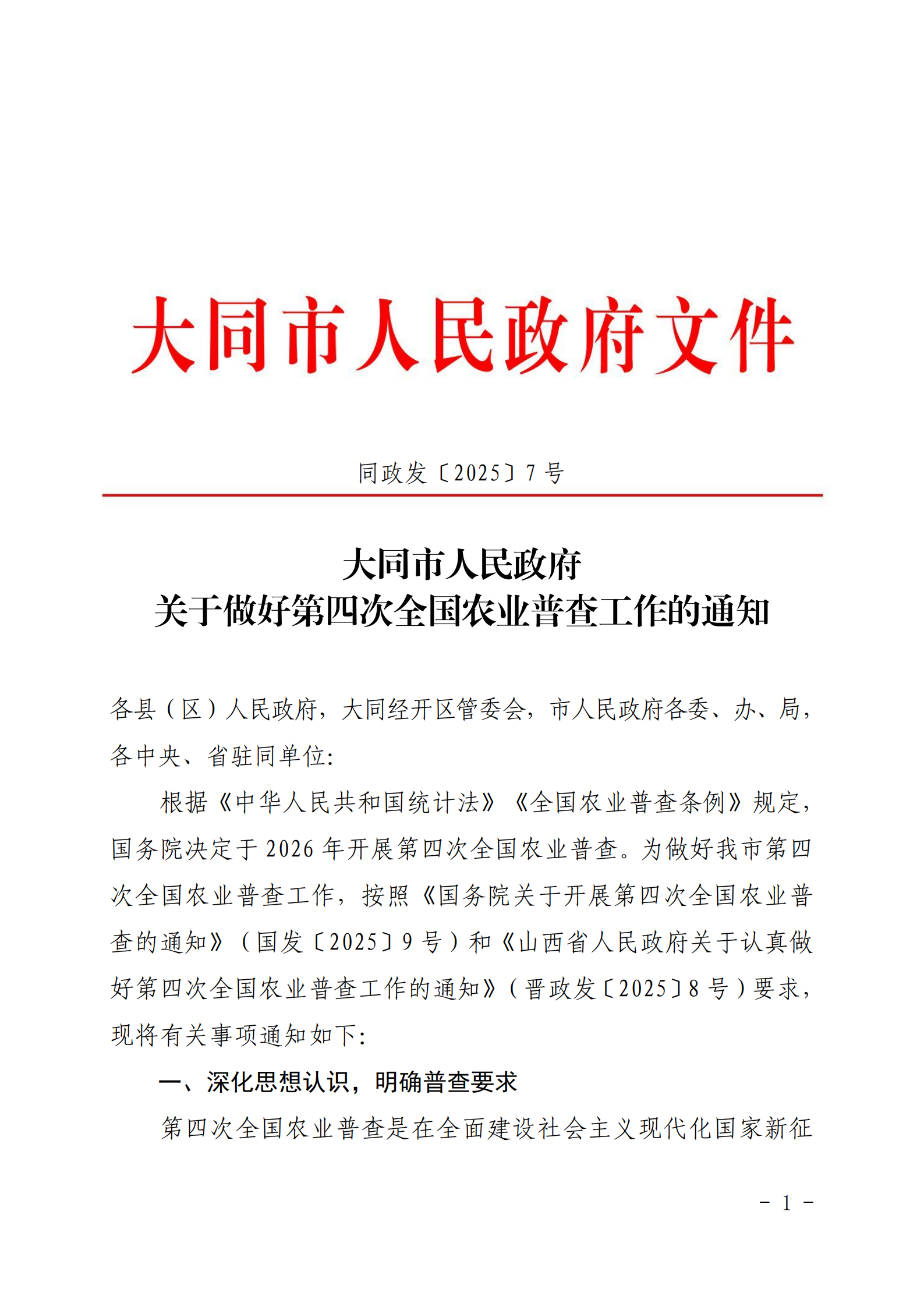 標  題: 大同市人民政府關于做好第四次全國農業普查工作的通知