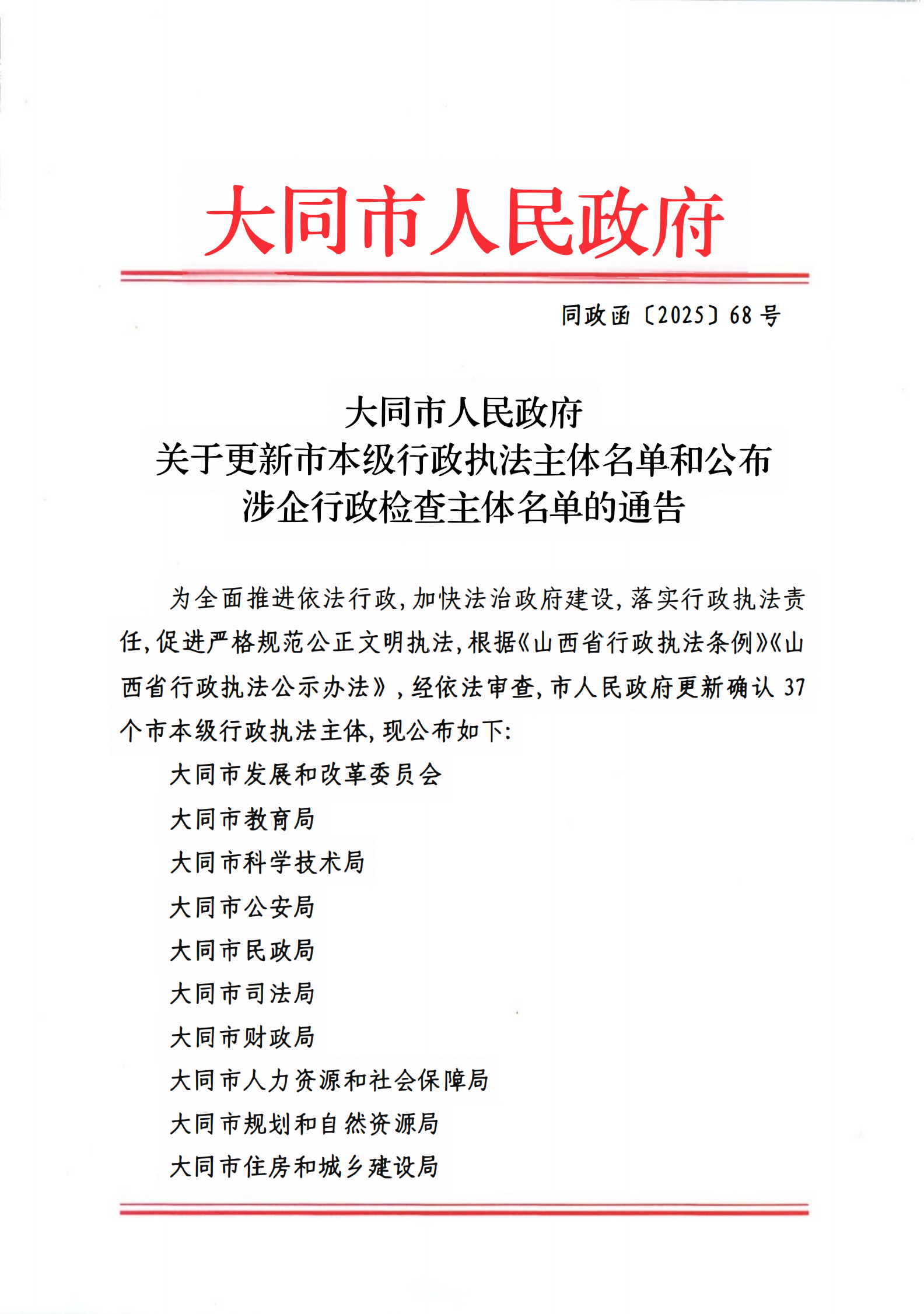 大同市人民政府關于更新市本級行政執法主體名單和公布涉企行政檢查主體名單的通告