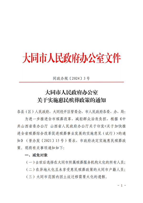 大同市人民政府辦公室關于實施惠民殯葬政策的通知