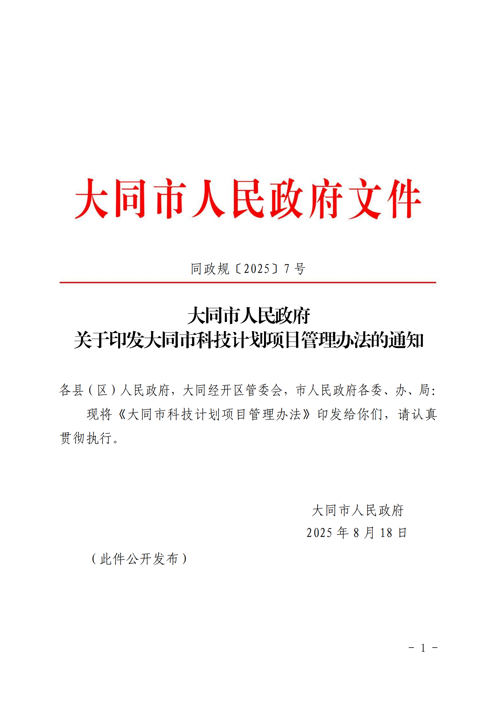 第一條 為激發全市科技創新活力,增強自主研發和科技成果轉化能力,進一步規范大同市科技計劃項目(以下簡稱“計劃項目”)運行管理,依據《山西省人民政府辦公廳關于印發山西省科技計劃項目管理辦法的通知》(晉政辦發〔2021〕42號),結合我市實際,制定本辦法。