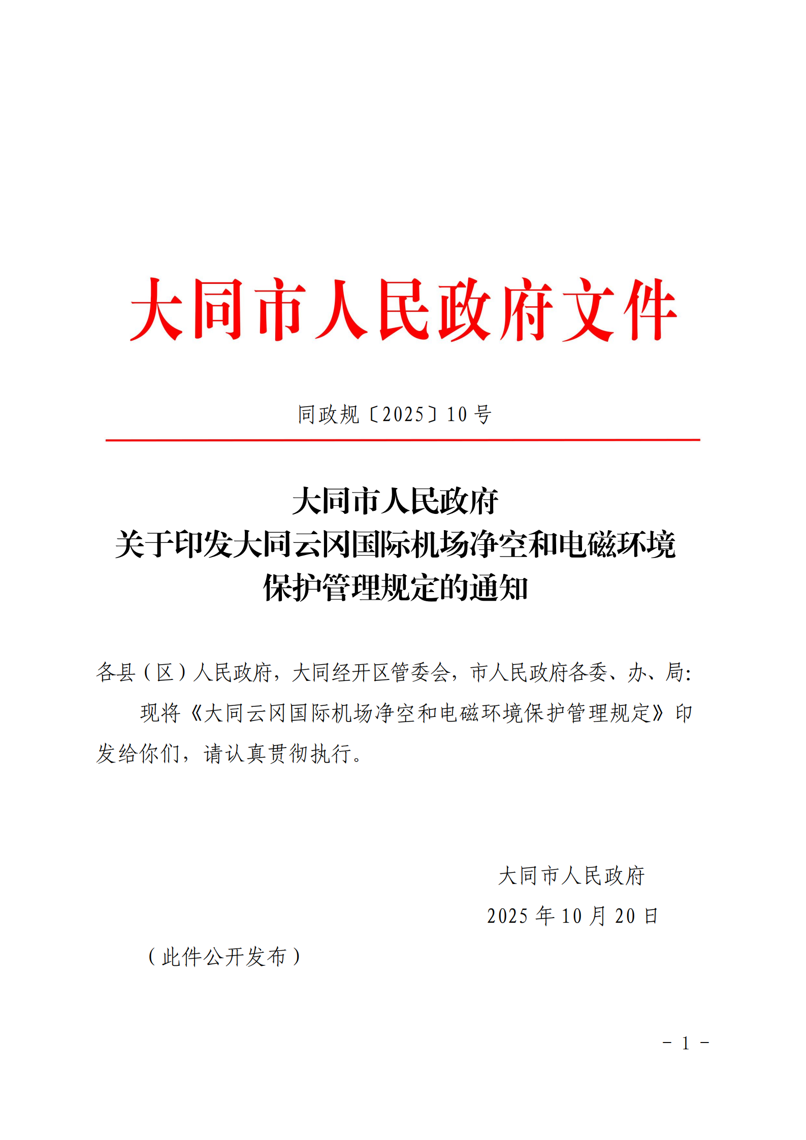 大同市人民政府關(guān)于印發(fā)大同云岡國際機場凈空和電磁環(huán)境保護管理規(guī)定的通知